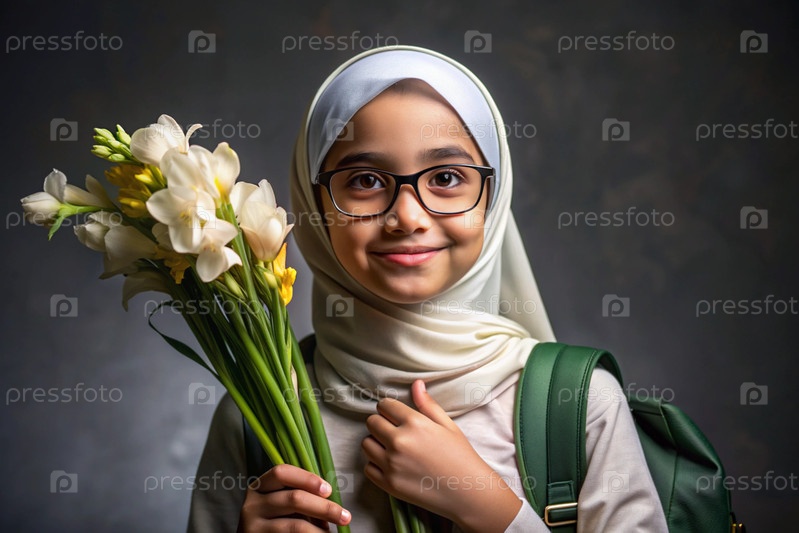 Первоклассник-мусульманин с очками на доске. Девушка держит цветы в руках. Ребенок пойдет в школу впервые. Ребёнок с рюкзаком, книгой и цветами. Возвращение к школе