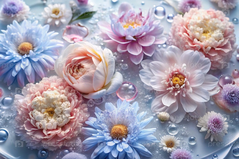 Красивый, воздушный, деликатный цветочный фон в синих и розовых тонах. цветы пиона, хризантемы, ромашки с каплями воды на лепестках