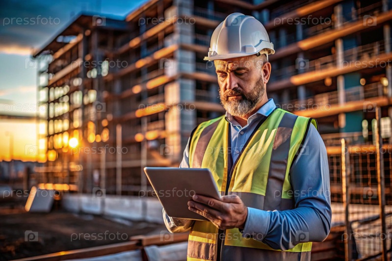 Строитель, главный мастер шлема и защитного жилета с планшетом в руке на строительной площадке, демонстрирующий внедрение технологий в строительство
