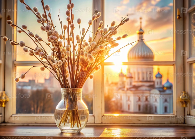 Большой план букета ивы в стеклянной вазе на фоне древнего белого окна с видом на золотые куполы храма и заходящее солнце