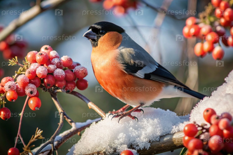 Милая красочная евразийская бульфинга, сидящая на ветке и питающаяся ягодами красного пепла