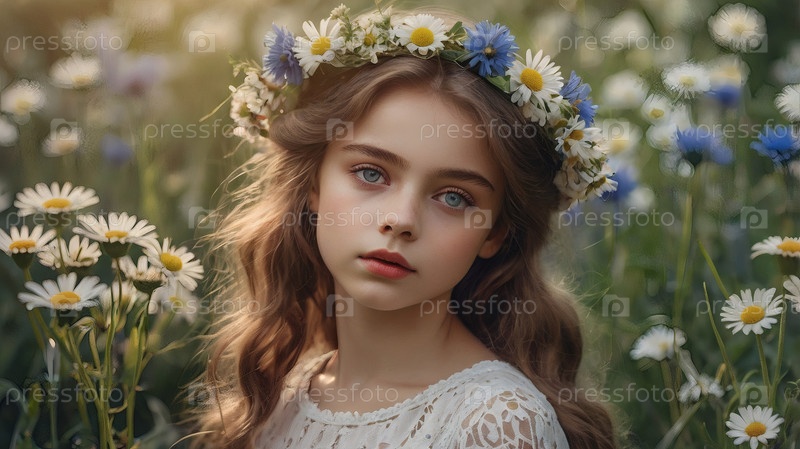 Красивая девушка с венком ромашки и кукурузных цветов на голове в поле. День святого Петра и Февронии. Всероссийский день семьи, любви, верности