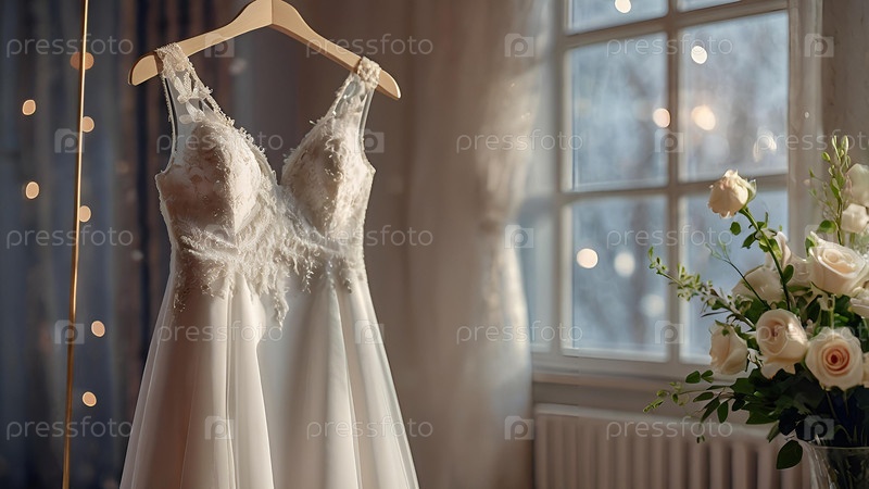 Близко. Элегантное белое свадебное платье на вешалке и букет цветов. Утро невесты. Аренда и покупка свадебных платьев для мероприятий