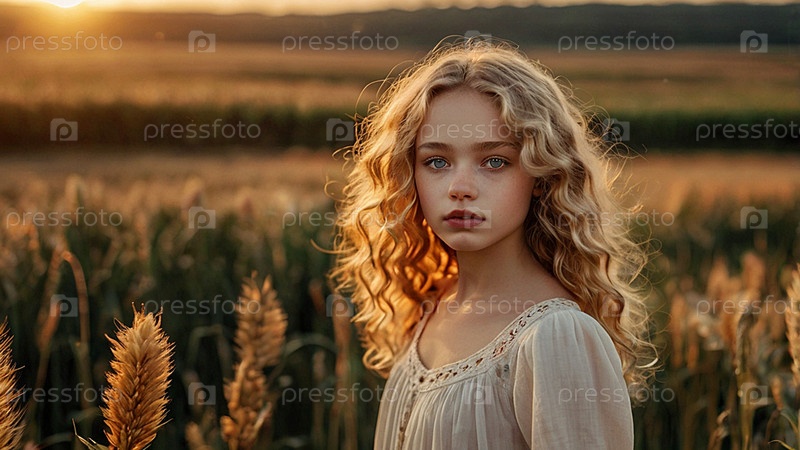 Теплый портрет красивой кудрявой женщины на пшеничном поле при закате солнца. Романтическая, спокойная и чувственная фотография девушки в деликатном платье