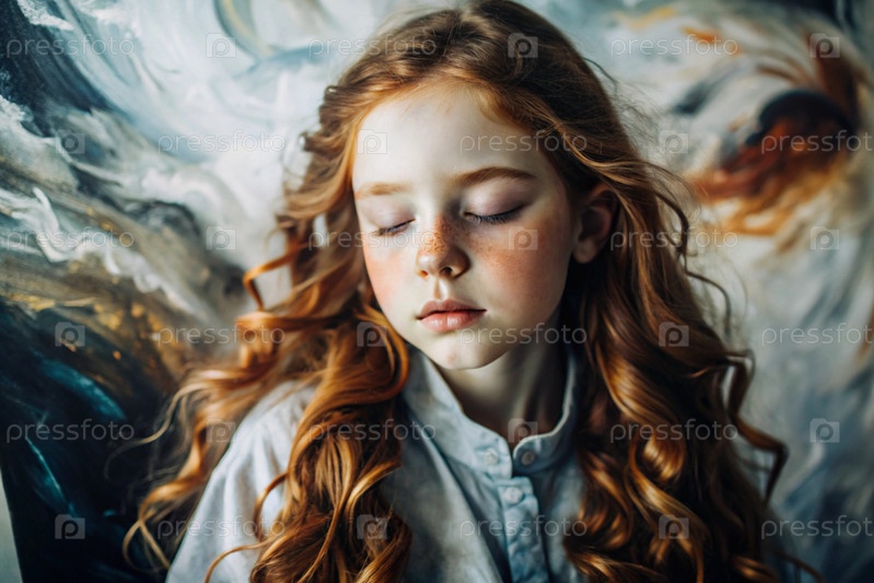 Портрет красивой маленькой рыжеволосой девочки с длинными волнистыми волосами и задумчивым взглядом.Власы развиваются и создают ощущение легкости и естественности