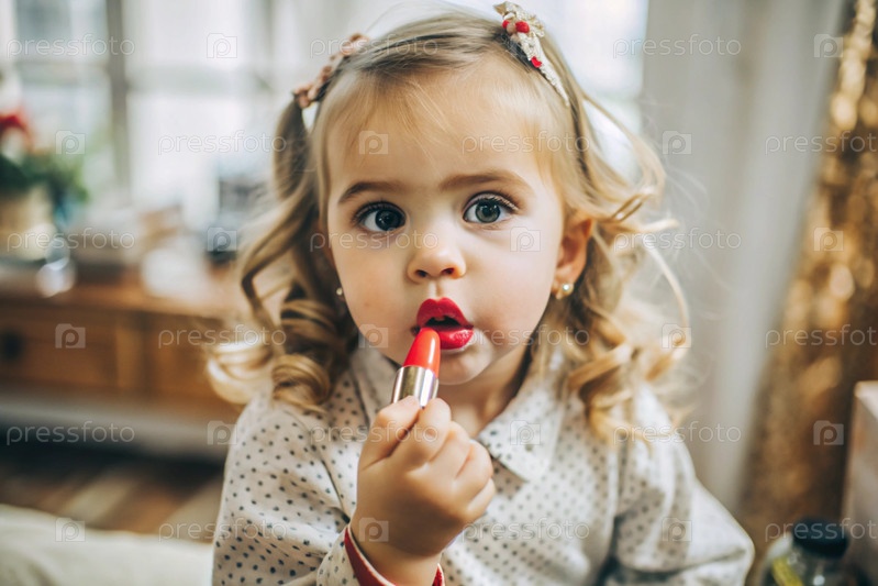Красивая, забавная девушка в платье рисует губы красной помадой как мама.Девушка играет с женской косметикой