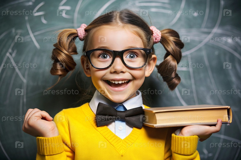 Красивая девушка с очками и книгами. Ребенок впервые ходит в школу. Ребёнок в классе с доской на заднем плане. Возвращение к школе