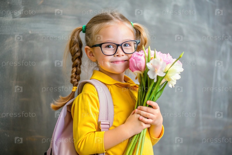 Красивая первоклассница с очками и коньими хвостами на голове. Букет осенних цветов. Ребенок впервые идет в школу. Ребёнок с рюкзаком, книгой и цветами. Возвращение в школу