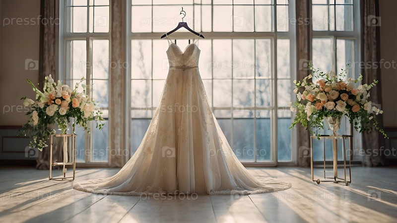Близко. Элегантное белое свадебное платье на вешалке и букет цветов. Утро невесты. Аренда и покупка свадебных платьев для мероприятий