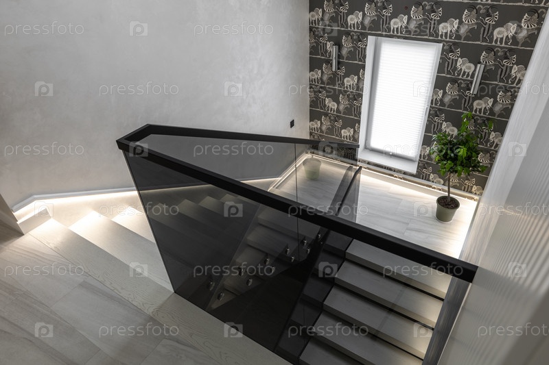Высокоугольный вид современной лестницы с темнотуневыми стеклянными перилами, интегрированным светодиодным ступенчатым освещением и декоративной черной обои с белыми узорами зебры