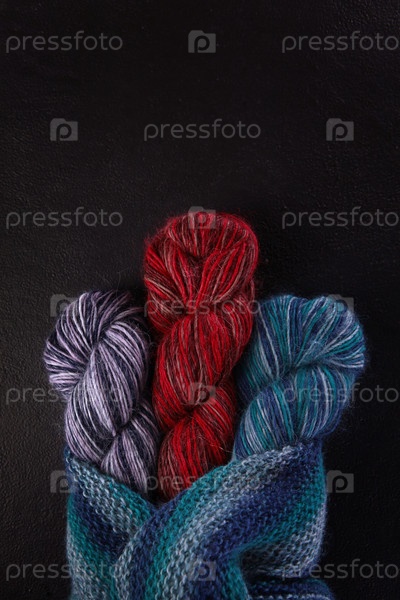 На столе расположены стиральные машины из многоцветной шерстяной пряжи. Игла для вязания теплой одежды. Концепция хобби и ремесел. Вид сверху