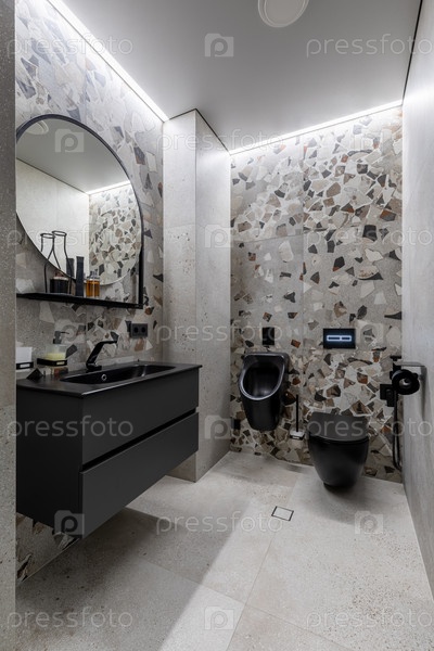 Полный вид на современную ванную комнату с черным тщеславием с круглым зеркалом, стеновым туалетом и мочеиспускателем против стильных плиток из терраццо и минималистического освещения