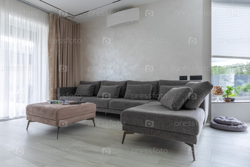 Современная открытая гостиная с большим серым секционным диваном, стильный османский и естественный свет. Яркий минималистический интерьер с вибрациями домашнего офиса, декоративными растениями, кроватью для питомцев и кондиционером на нейтральной текстур