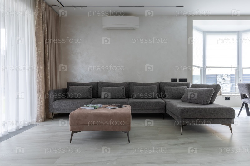 Яркий интерьер квартиры с минималистическим декором, текстурированной нейтральной стеной, кондиционером и естественным светом от больших окон