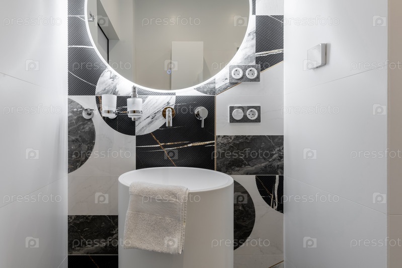 Близкая стильная ванная комната с большим освещенным круглым зеркалом, современной белой пьедестальной раковиной и художественными стеновыми плитками со смесью геометрических мраморных узоров и черной флейты