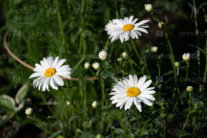 Красочные белые ромашки с желтым центром процветают в саду поздней весной, окруженные свежей зеленой лиственницей и цветами, создавая живую и веселую атмосферу