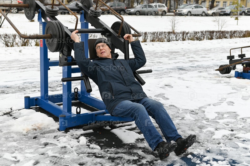 Мужчина тренируется на открытом воздухе на спортивном оборудовании зимой в городском парке