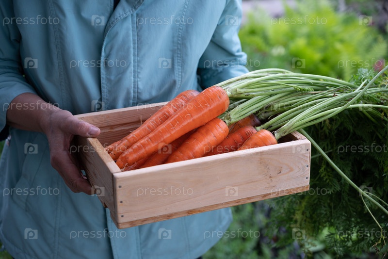 Мужчина в перчатках держит кучу свежесобранных апельсиновых морковь, которые покрыты почвой и демонстрируют свой яркий цвет на пышном зеленом фоне лиственных овощей
