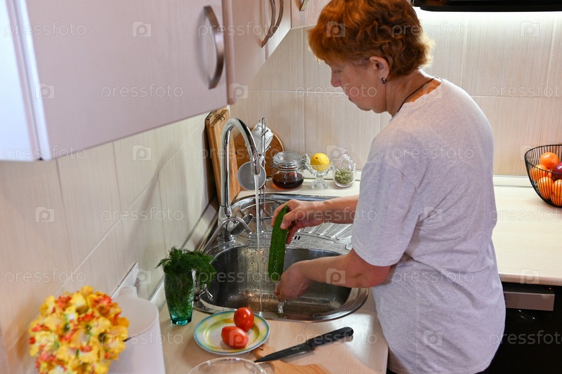 Женщина моет овощи на кухне днем с цветами, украшенными поблизости