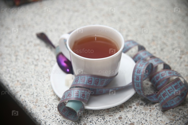 Чашка чая, кубики сахара и сантиметровая лента