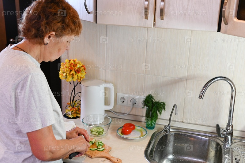 Мужчина на кухне нарезает овощи на режущей доске.Вблизи есть свежие ингредиенты, такие как огурцы и помидоры.На заднем плане видны раковина и другие кухонные принадлежности