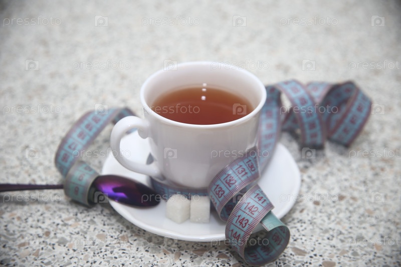 Чашка чая, кубики сахара и сантиметровая лента