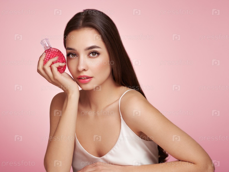 Красивая молодая женщина с бутылкой парфюма