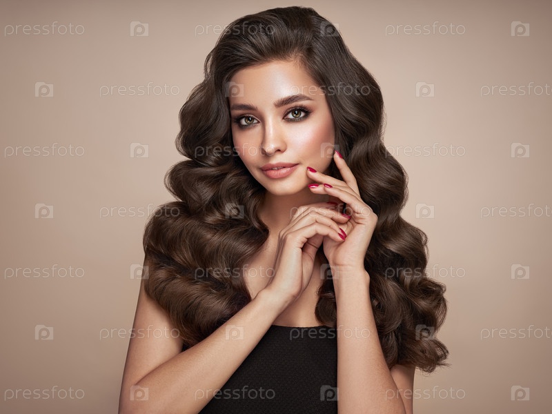 Улыбающаяся красивая женщина с длинными кудрявыми волосами