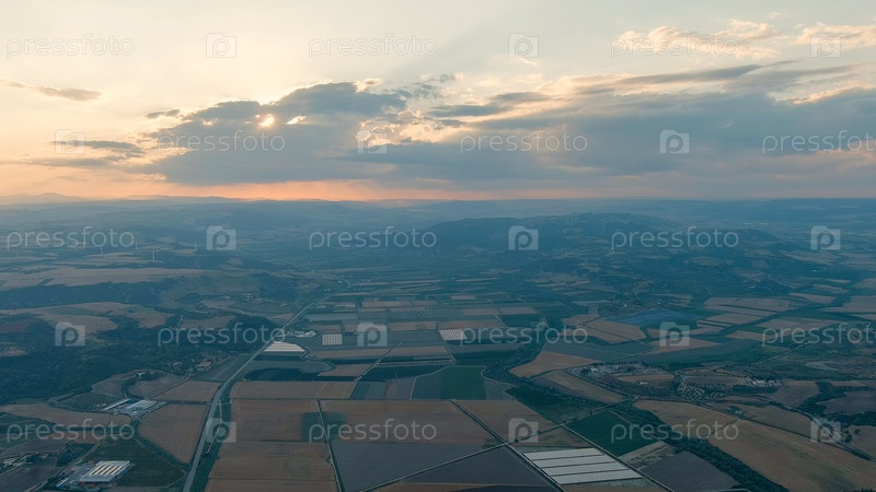 Геометрические сельскохозяйственные поля разных оттенков в свете солнца, пробивающегося сквозь облака
