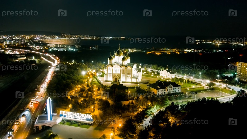 Геленджик, Россия. собор святого Андрея Первозванного. текст на шоссе М4-Дон переводится: слава России, городской курорт 'Геленджик'. ночное время, вид с воздуха