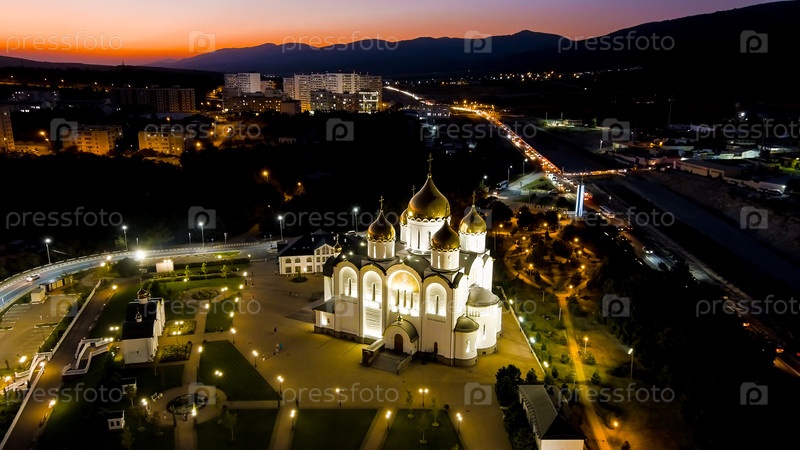 Геленджик, Россия. собор святого Андрея Первозванного. парк Андреевский. ночное время, взгляд с воздуха