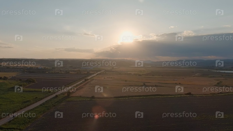 Геометрические сельскохозяйственные поля разных оттенков в свете солнца, пробивающегося сквозь облака