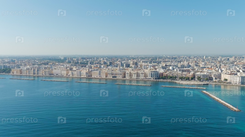 Бари, Италия.Центральная набережная города в течение дня.Лунгомаре ди Бари.Бари - портовый город на Адриатическом побережье, вид с воздуха