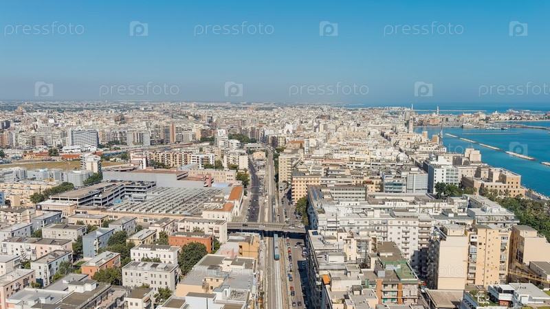 Бари, Италия.Центральная часть города днем.Железная дорога на улице Анастасио Баллестреро.Лето.Бари - портовый город на Адриатическом побережье, вид с воздуха
