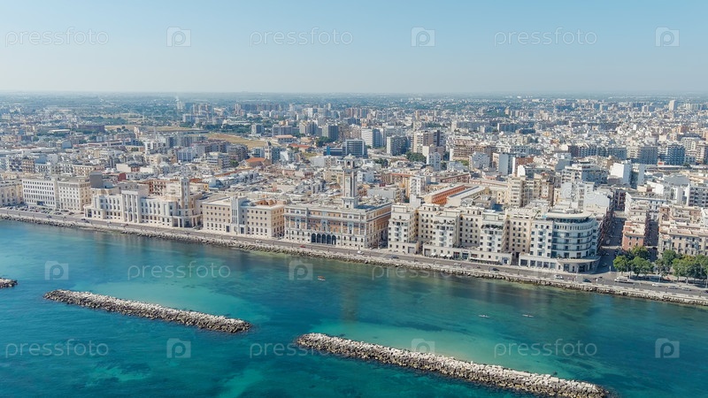 Бари, Италия.Центральная набережная города в течение дня.Лунгомаре ди Бари.Бари - портовый город на Адриатическом побережье, вид с воздуха