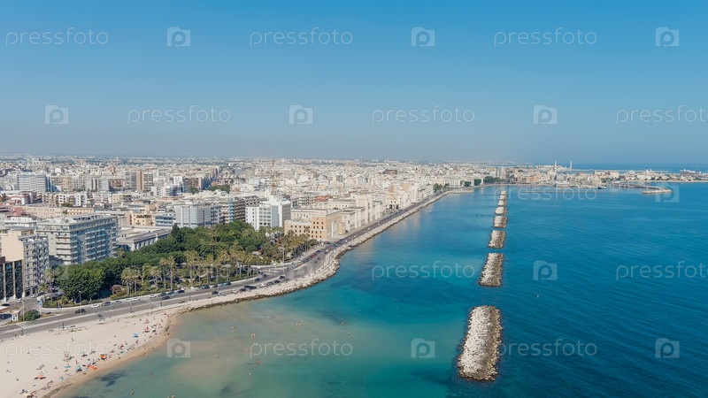 Бари, Италия.Центральная набережная города в течение дня.Лунгомаре ди Бари.Бари - портовый город на Адриатическом побережье, вид с воздуха