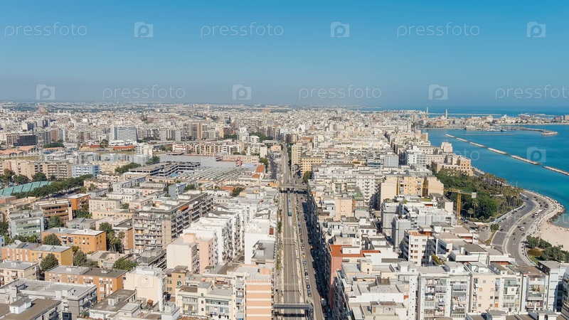 Бари, Италия.Центральная часть города днем.Железная дорога на улице Анастасио Баллестреро.Лето.Бари - портовый город на Адриатическом побережье, вид с воздуха