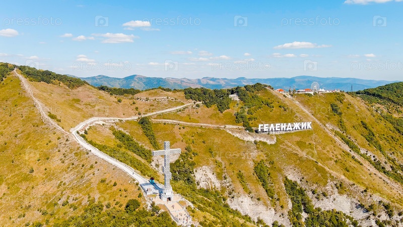 Геленджик, Россия. Парк Маркота. Крест поклонения. Перевод текста на склоне на английский язык - Геленжик, Вид с воздуха