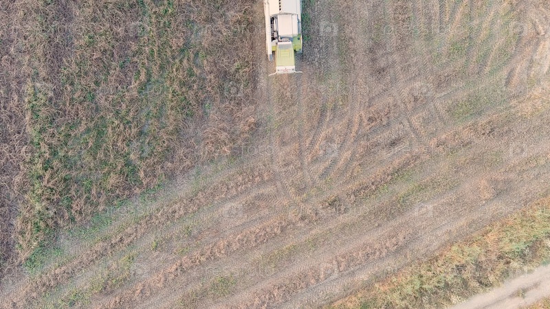 Жатва поля с помощью комбайна в свете вечернего солнца, Aerial View