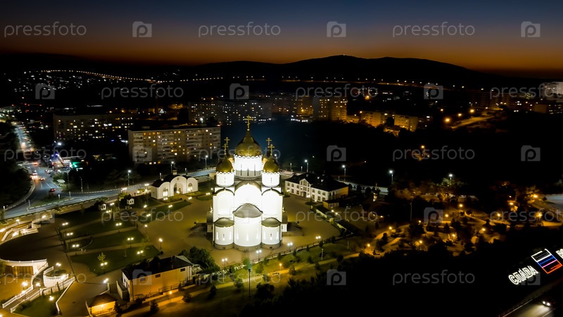 Геленджик, Россия. собор святого Андрея Первозванного. текст на шоссе М4-Дон переводится: слава России, городской курорт 'Геленджик'. ночное время, вид с воздуха