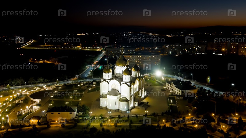 Геленджик, Россия. собор святого Андрея Первозванного. ночное время, вид с воздуха