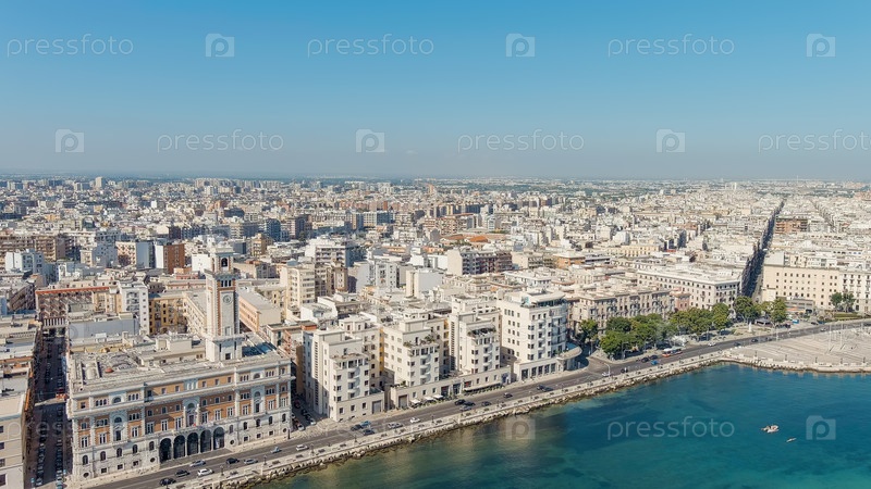 Бари, Италия.Центральная набережная города в течение дня.Лунгомаре ди Бари.Бари - портовый город на Адриатическом побережье, вид с воздуха