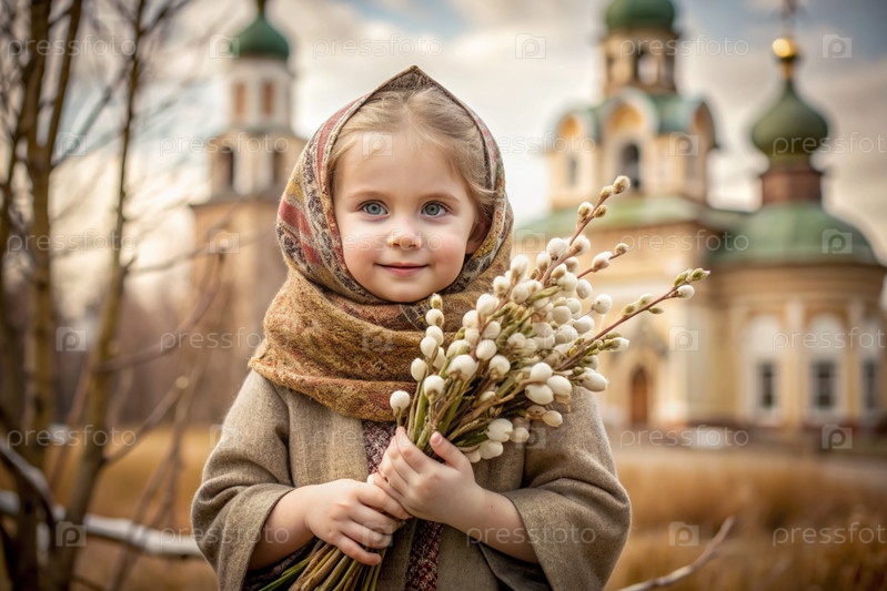Пальмовое воскресенье. христианство. портрет трехлетней девочки в русском народном шале с ветвями ивы в руках на фоне православной церкви