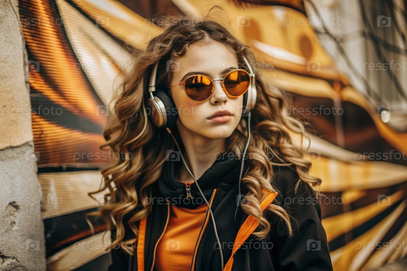 Молодая красивая девушка с большими наушниками и солнцезащитными очками слушает музыку на ушах