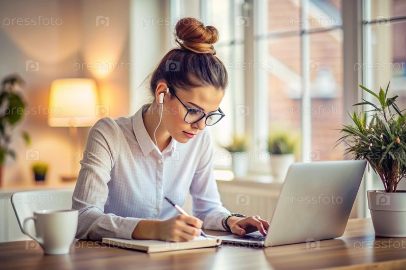 Молодая женщина фрилансер в очках и наушниках работает на ноутбуке или делает покупки в интернет-магазине