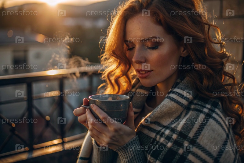 Красивая рыжеволосая женщина, завернутая в клетку с кружкой горячего кофе на красивом террасе под лучами заходящего солнца