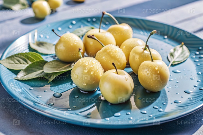Закрытие свежих слив. Вкусные ягоды и фрукты ярко-желтого и фиолетового цвета с капельками воды. Вегетарианство. Здоровое питание. Свежие плоды на столе