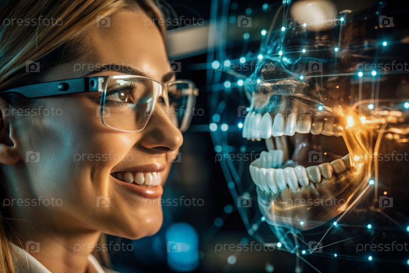 Новые технологии цифрового искусственного интеллекта в зубных протезах. Имплантаты. Женщина-стоматолог с идеальной улыбкой и цифровая графика на виртуальном экране. Концепция стоматологического здоровья и ухода за зубами