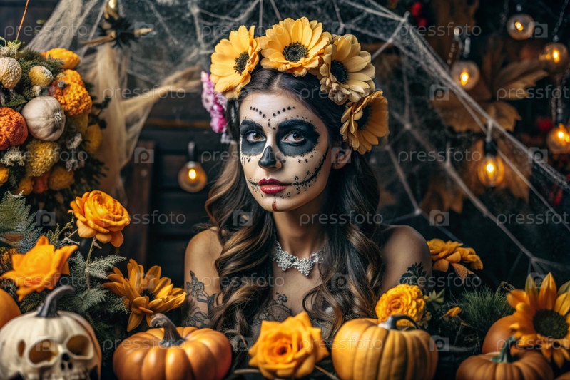 Концепция Хэллоуина. Ужасно. Костюмированная вечеринка. Красивая женщина с покрашенным черепом на лице и цветами на голове. Баннер, открытка