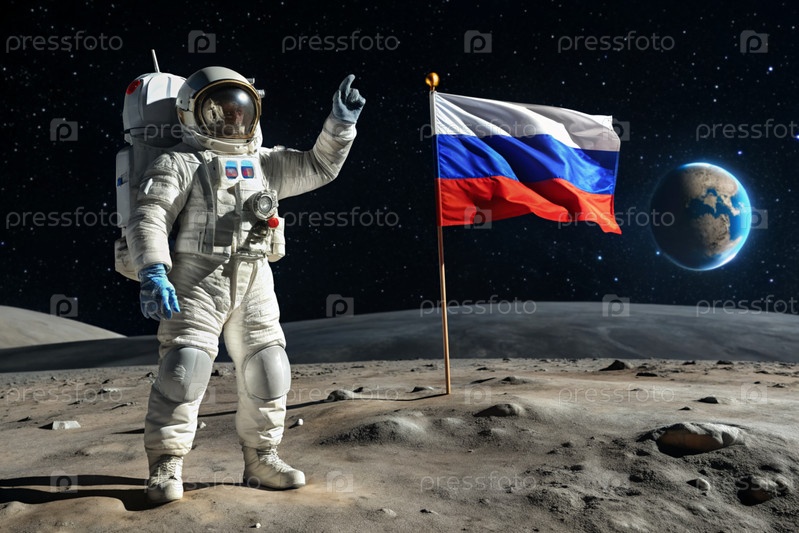 Счастливый День космического пространства.Астронавт в костюме устанавливает российский флаг в космосе на Луне.Впечатляющий вид планеты Земля